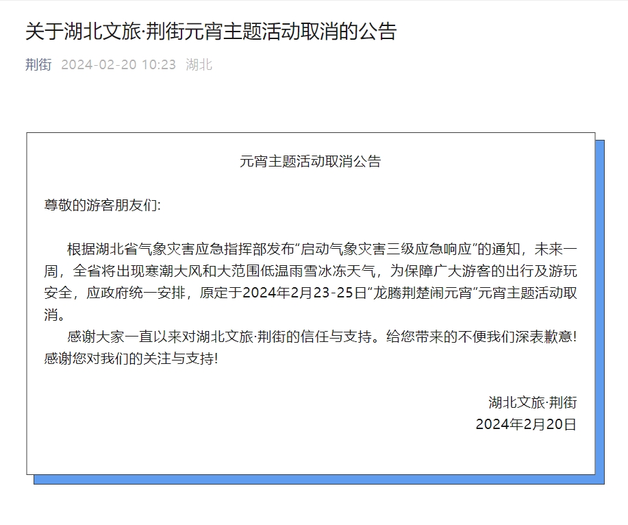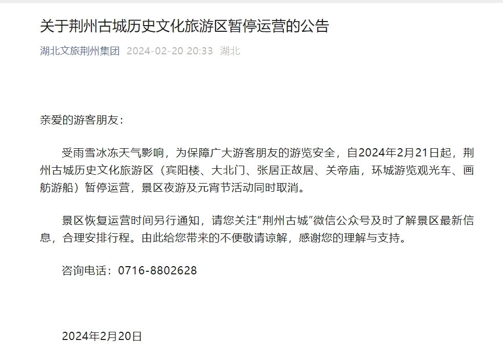 2月20日,公司黨委副書(shū)記、總經(jīng)理王海生主持召開(kāi)防范低溫雨雪冰凍天氣動(dòng)員會(huì),強(qiáng)調(diào)落實(shí)省、市和總部工作要求,部署旗下景區(qū)、街區(qū)交通、高墜、水電、網(wǎng)絡(luò)安全工作。第一時(shí)間響應(yīng)荊州市委市政府要求,安排荊州古城歷史文化旅游區(qū)暫停運(yùn)營(yíng),荊街取消元宵節(jié)活動(dòng)。
